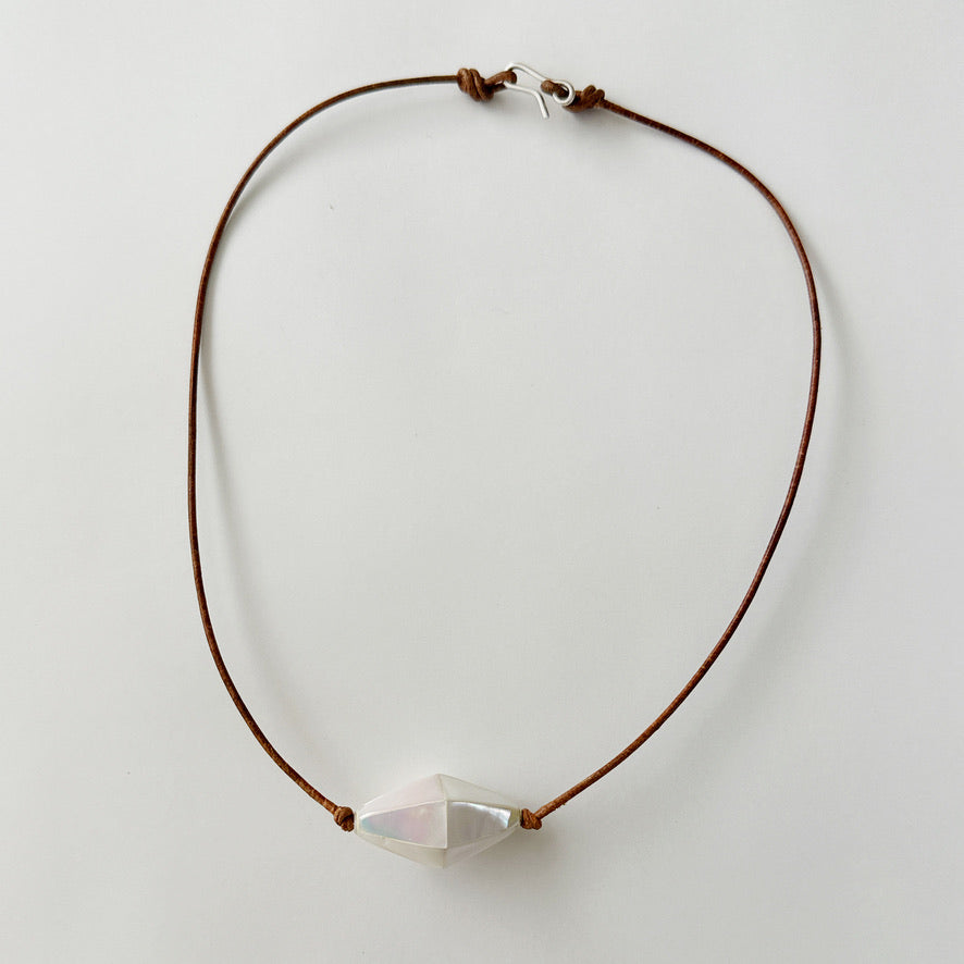 Handmade leather necklace with mother of pearl and sterling silver hook clasp.
