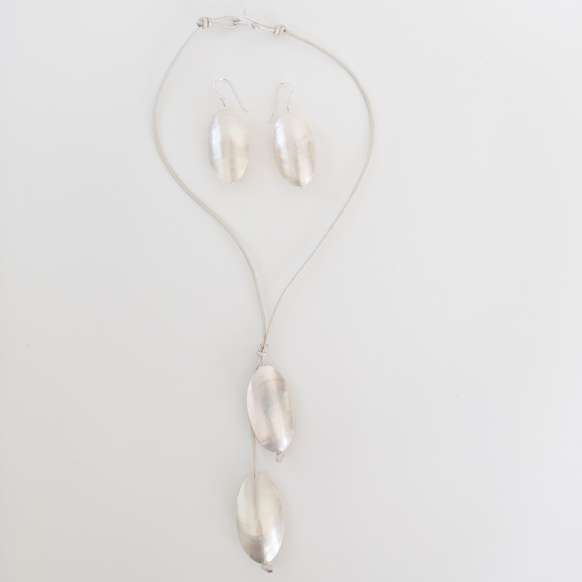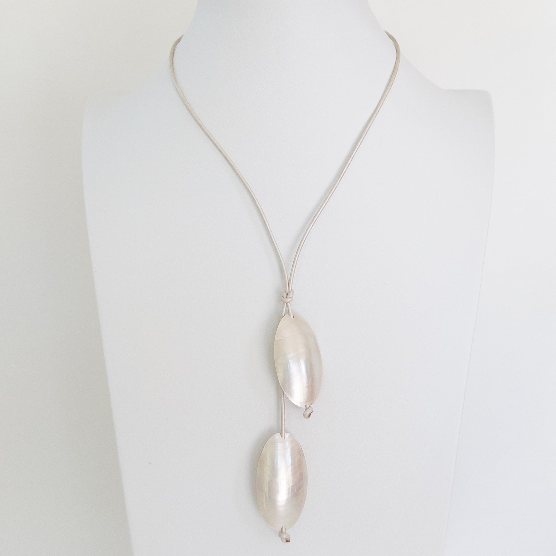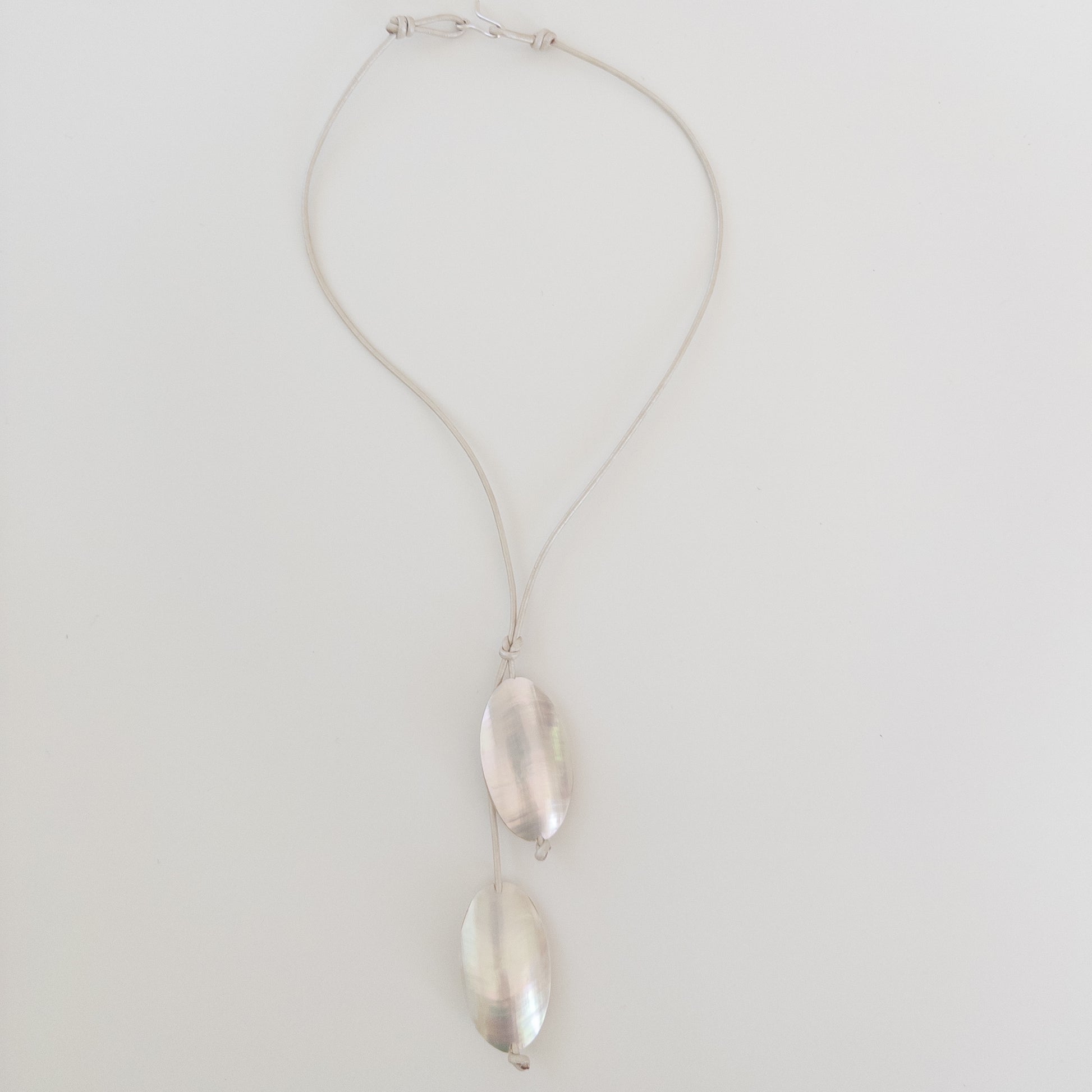 Handmade leather necklace with mother of pearl and sterling sliver hook clasp.