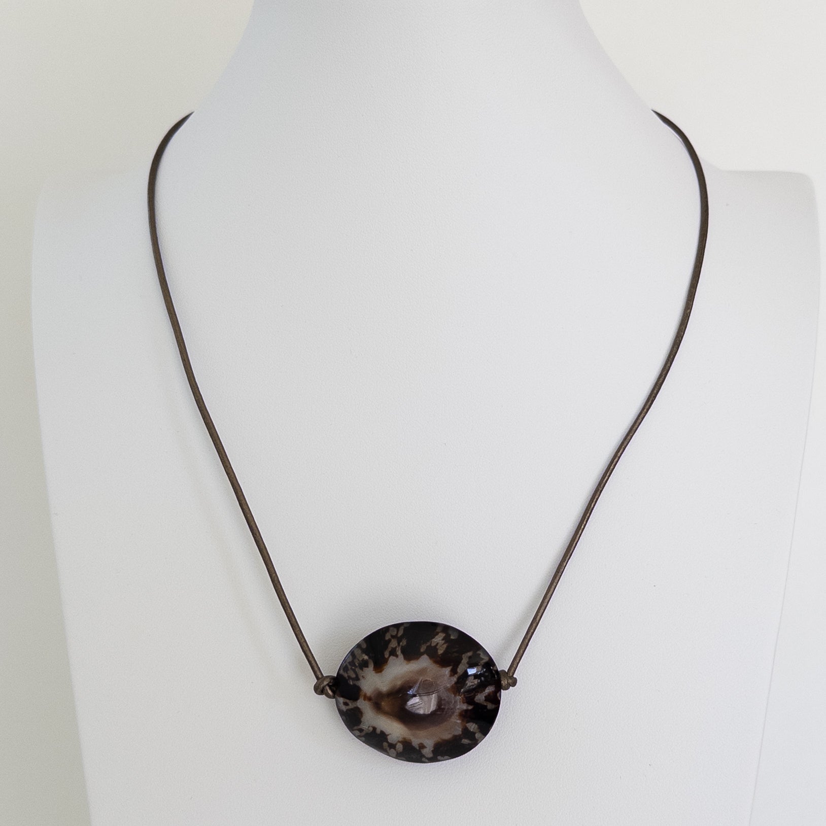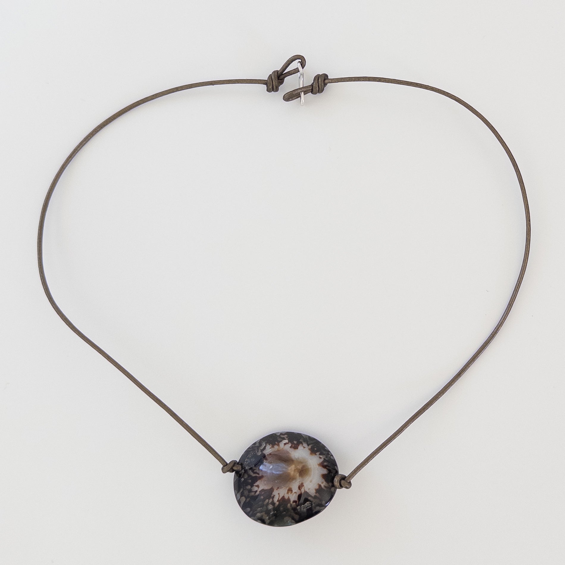 Handmade leather necklace with mother of pearl and sterling sliver hook clasp.
