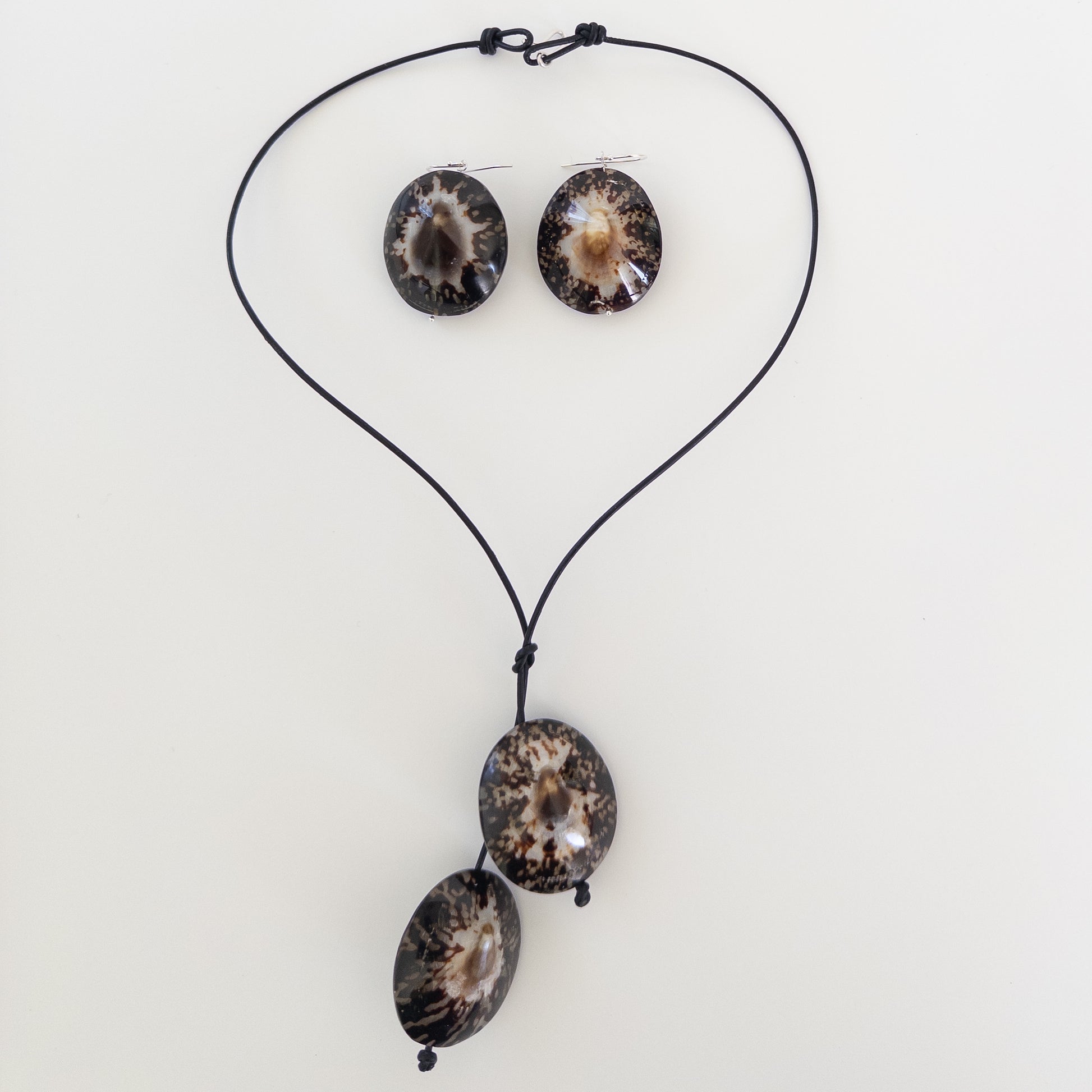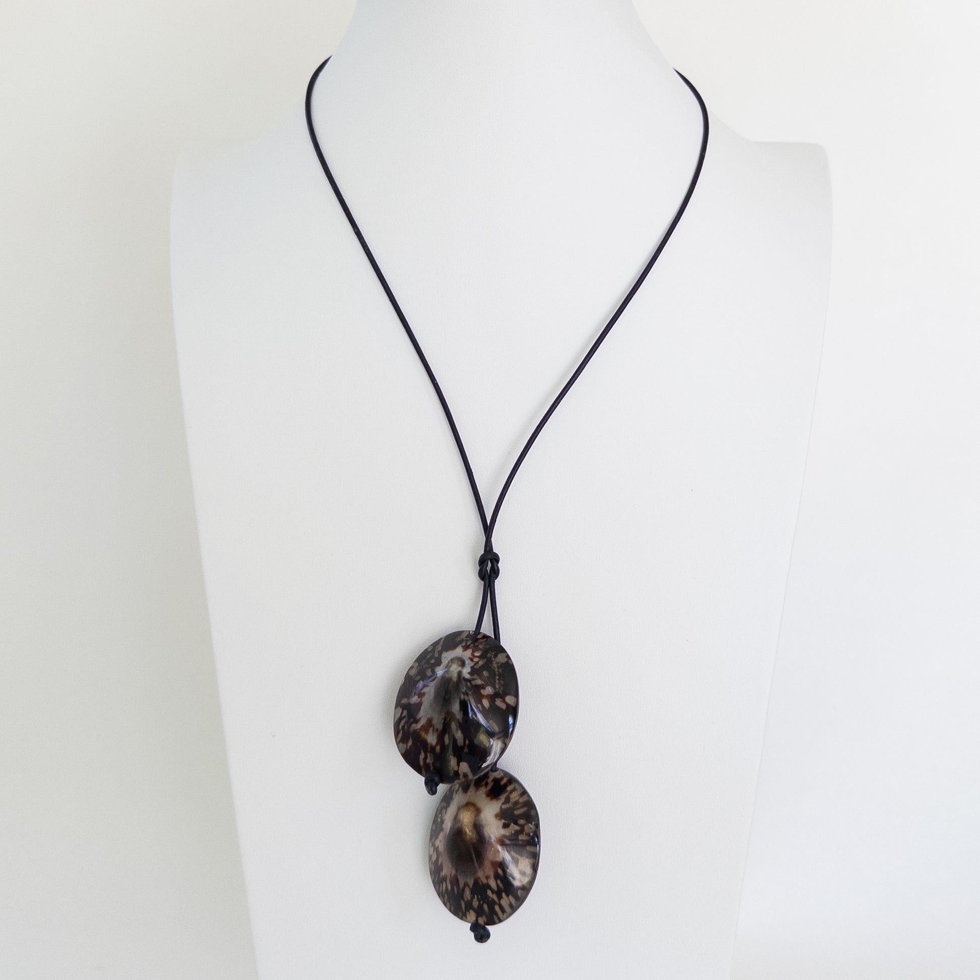 Handmade leather necklace with mother of pearl and sterling sliver hook clasp.