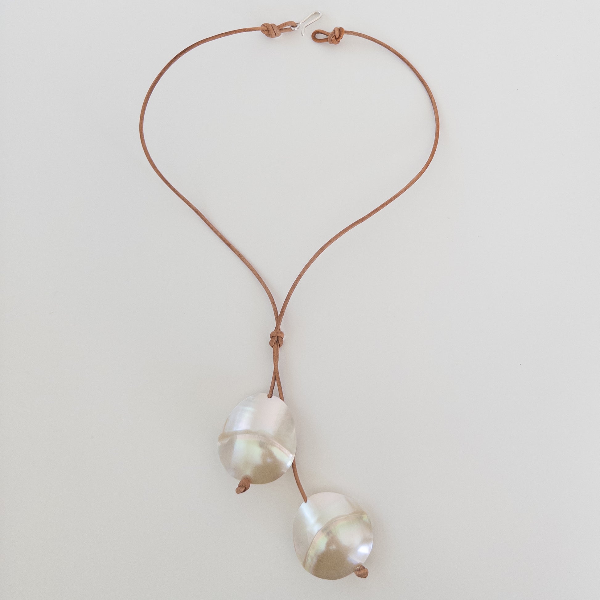Handmade leather necklace with mother of pearl and sterling sliver hook clasp.